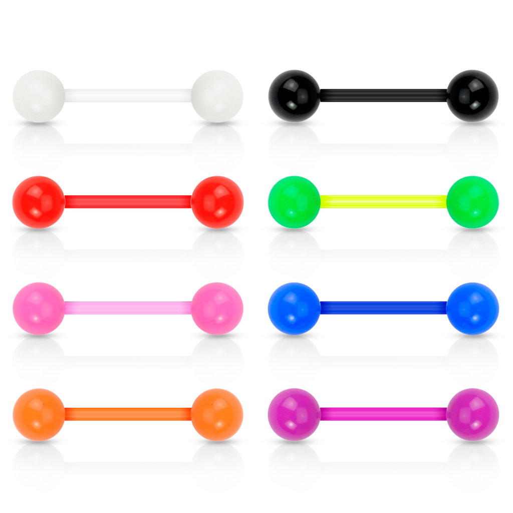 În această ofertă veți obține un total de 8 piercing-uri de culori diferite care sunt fabricate din PTFE / bioplastic. PTFE este un material plastic moale și flexibil, care are mai multe avantaje. Este foarte confortabil în utilizare, tocmai pentru că tija este flexibilă și, prin urmare, vă va deranja limba cât mai puțin posibil. Dacă vă ”arcuiți” limba tija se va ”arcui” împreună cu ea. De fapt, vă mișcați limba în fiecare zi în fiecare zi, așa încât un piercing în limba cu o tijă care urmează mișcările limbii poate fi un avantaj imens.
