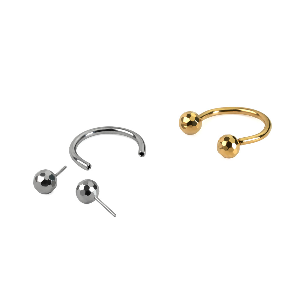 Această potcoavă din titan este fără fir, ceea ce înseamnă că bilele au pinuri mici pe care le împingi în potcoavă pentru a le fixa în piercing. Bilele au multiple fațete care le oferă un look cool și texturat ce amintește de disco ball-uri.