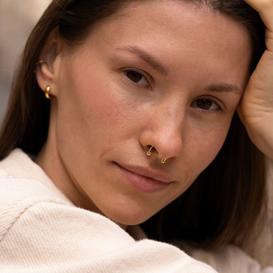 Bijuteria de aici este potrivită cu multe piercinguri, inclusiv în sprânceană, ureche și sept și este disponibilă în variantele auriu și lucios.