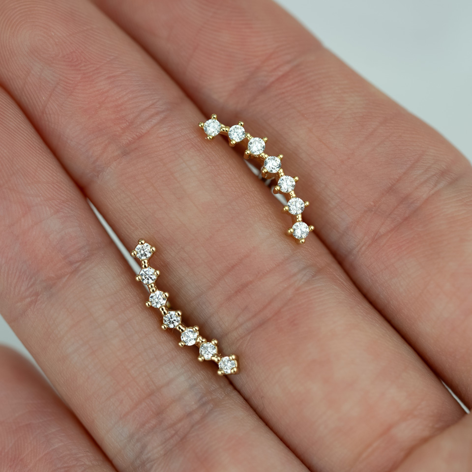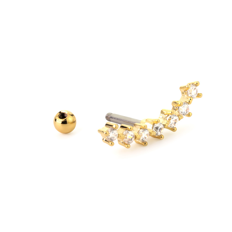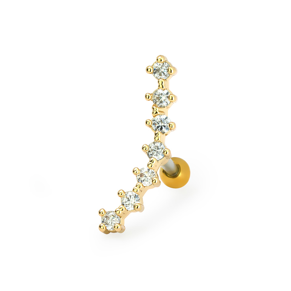 O bijuterie de ureche specială completează orice ținută și, dacă ai nevoie de una care să iasă în evidență, este ceea ce cauți. Această barbell curbată strălucește ca un șir de stele pe cerul nopții. Bijuteria atrage destulă atenție de una singură, dar o poți folosi în mai multe combinații de bijuterii. De exemplu, o poți purta în helix, conch sau lobul urechii. O poți roti în mai multe poziții și încerca în diferite combinații.