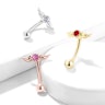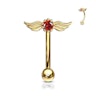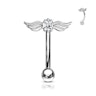 Bijuteria pe care o vezi în poză este o barbell curbată și se potrivește extrem de bine în piercing-urile de sprânceană. Bara are o lungime de 8 mm și o grosime de 16g (1.2 mm). Bila din capăt este de 3 mm și poate fi înșurubată și deșurubată. Vârful nu este o bilă normală, ci o pereche de aripi de înger. Între aripi este o piatră frumoasă în diferite culori în funcție de culoarea tijei pe care o selectezi.