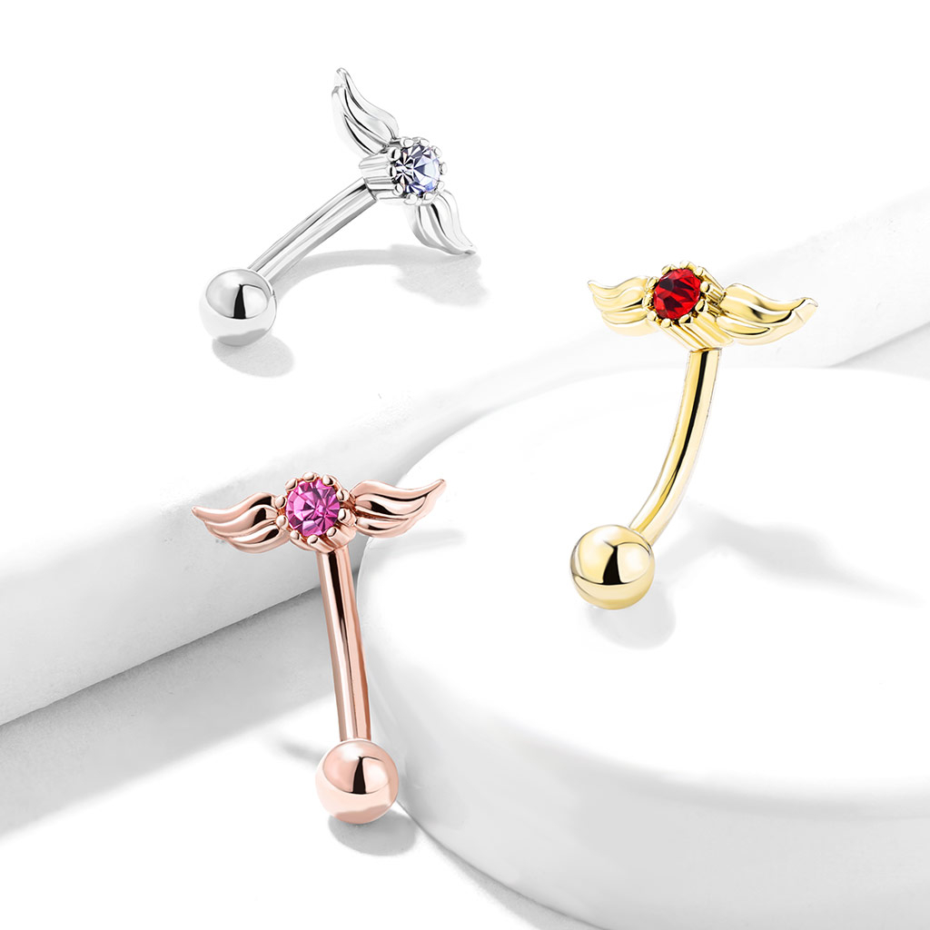 Bijuteria pe care o vezi în poză este o barbell curbată și se potrivește extrem de bine în piercing-urile de sprânceană. Bara are o lungime de 8 mm și o grosime de 16g (1.2 mm). Bila din capăt este de 3 mm și poate fi înșurubată și deșurubată. Vârful nu este o bilă normală, ci o pereche de aripi de înger. Între aripi este o piatră frumoasă în diferite culori în funcție de culoarea tijei pe care o selectezi.