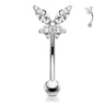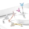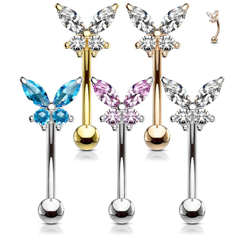 Bijuteria pe care ți-o prezentăm aici este decorată cu două pietre mici rotunde și două pietre ovale ce îi formează aripile. Poți alege culoarea acestor pietre dacă faci click pe meniul din dreapta pozei ca să vezi toate opțiunile disponibile. Aceste pietre sunt ținute pe loc de un model pave; așadar nu a fost nevoie să se folosească lipici. Dar, nu recomandăm să se folosească bijuteria când intri în contact cu apa.