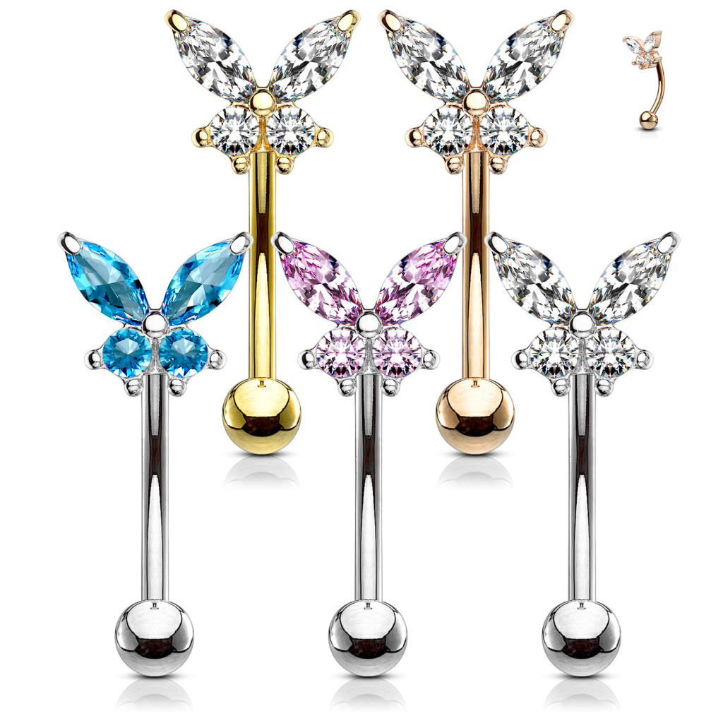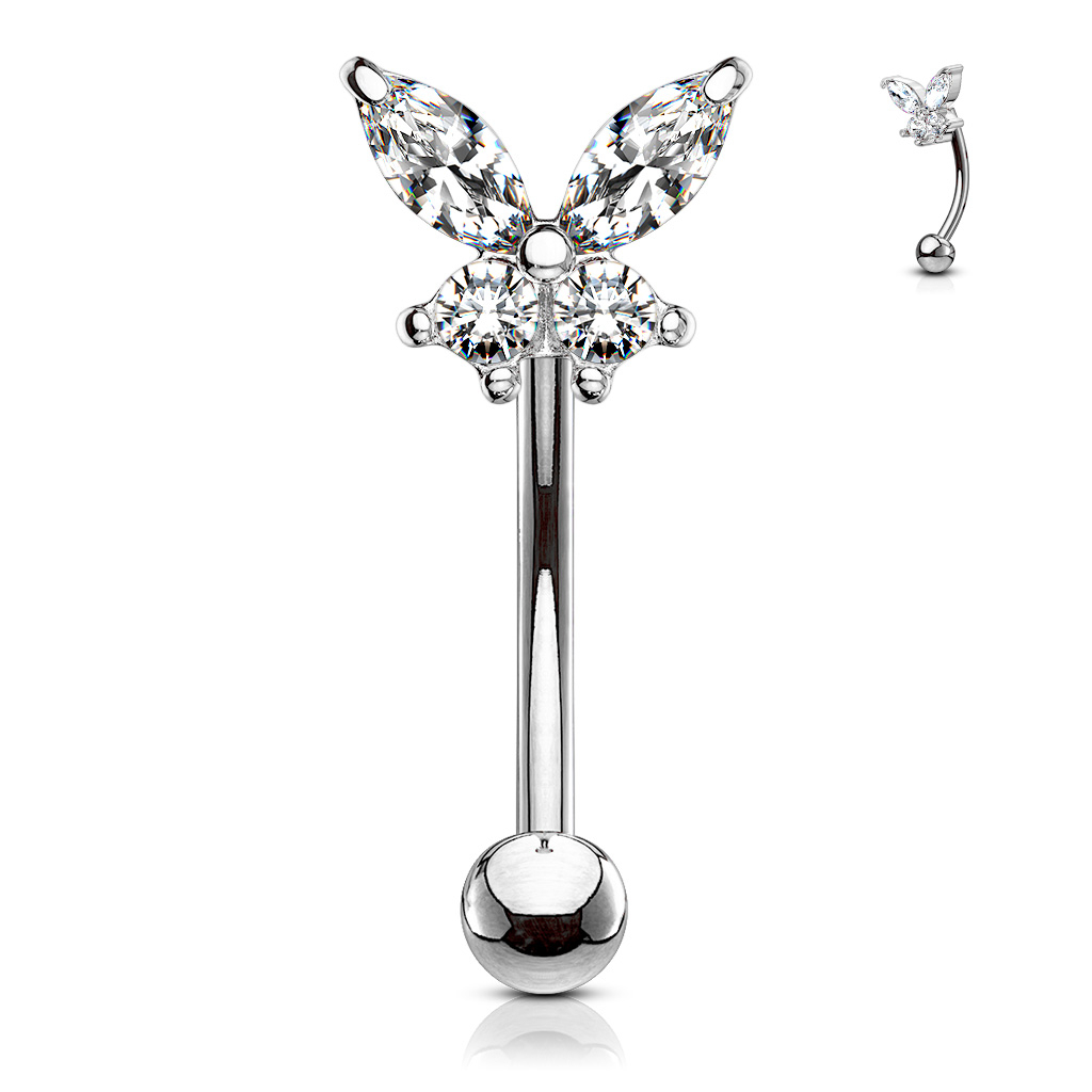 Bijuteria pe care ți-o prezentăm aici este decorată cu două pietre mici rotunde și două pietre ovale ce îi formează aripile. Poți alege culoarea acestor pietre dacă faci click pe meniul din dreapta pozei ca să vezi toate opțiunile disponibile. Aceste pietre sunt ținute pe loc de un model pave; așadar nu a fost nevoie să se folosească lipici. Dar, nu recomandăm să se folosească bijuteria când intri în contact cu apa.