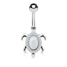 Îți plac animalele marine, inclusiv broaștele țestoase? Atunci avem bijuteria de buric perfectă pentru tine. Acest cercel ombilical este realizat din oțel chirurgical și are la capăt o față din alamă. Partea frontală a acestei piese este făcută să arate ca carapace. Broasca țestoasă are două pietre negre pe cap, care de fat sunt ochii ei. Pe carapacea țestoasei există o mare piatră opal sintetică în mijloc. Această piatră opal este înconjurată de o mulțime de pietricele. Deși opalul este artificial, acesta arată la fel de frumos ca un opal adevărat.