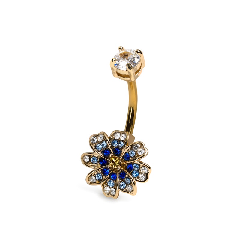Acest barbel drăguț este făcut pentru sezonul crop top. Are o floare realizată din pietre micuțe în diferite nuanțe de albastru, cu o piatră centrală galbenă. Bila de sus are o piatră transparentă.