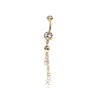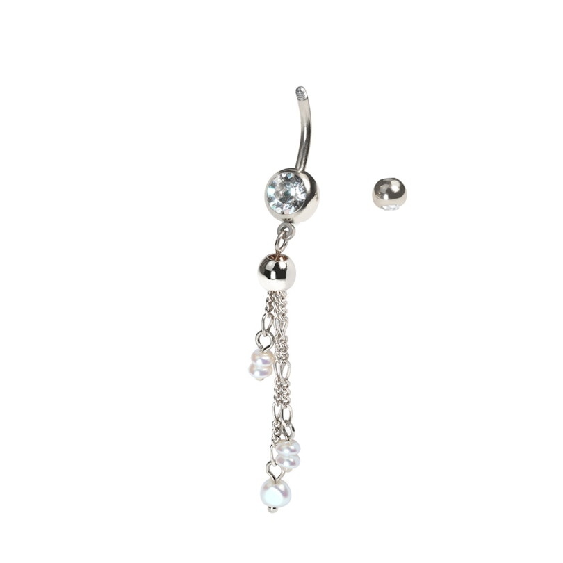 Acest barbell de buric cu lanțuri și perle are pietre de zirconia fixate în gheruțe pe ambele bile, iar din bila de jos atârnă lanțuri delicate cu perle sintetice în diferite dimensiuni.