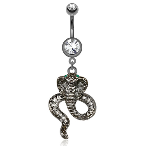 Acest șarpe din cupru care atârnă din acest piercing ombilical pare ca șuieră și pare chiar viu. Corpul șerpuit al acestei cobre este foarte detaliat. Ea este astfel realizată cu un efect 3D, astfel încât capul se apleacă în sus și în exterior, cu exact aceeași formă ca o cobră autentică. Dacă îl întorci, are și "modelul specific șarpelui" pe spate. Este acelasi model usor canelat care poate fi vazut pe partea superioara a șarpelui din față, chiar sub cap. Pe restul corpului, șarpele este decorat cu o mulțime de pietricele încrustate, iar ochii lui sunt marcați cu două pietre ce culoare verde turcoaz. Este cu adevărat un design foarte bine conceput și frumos.