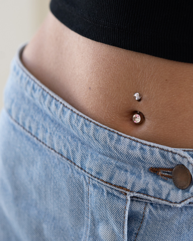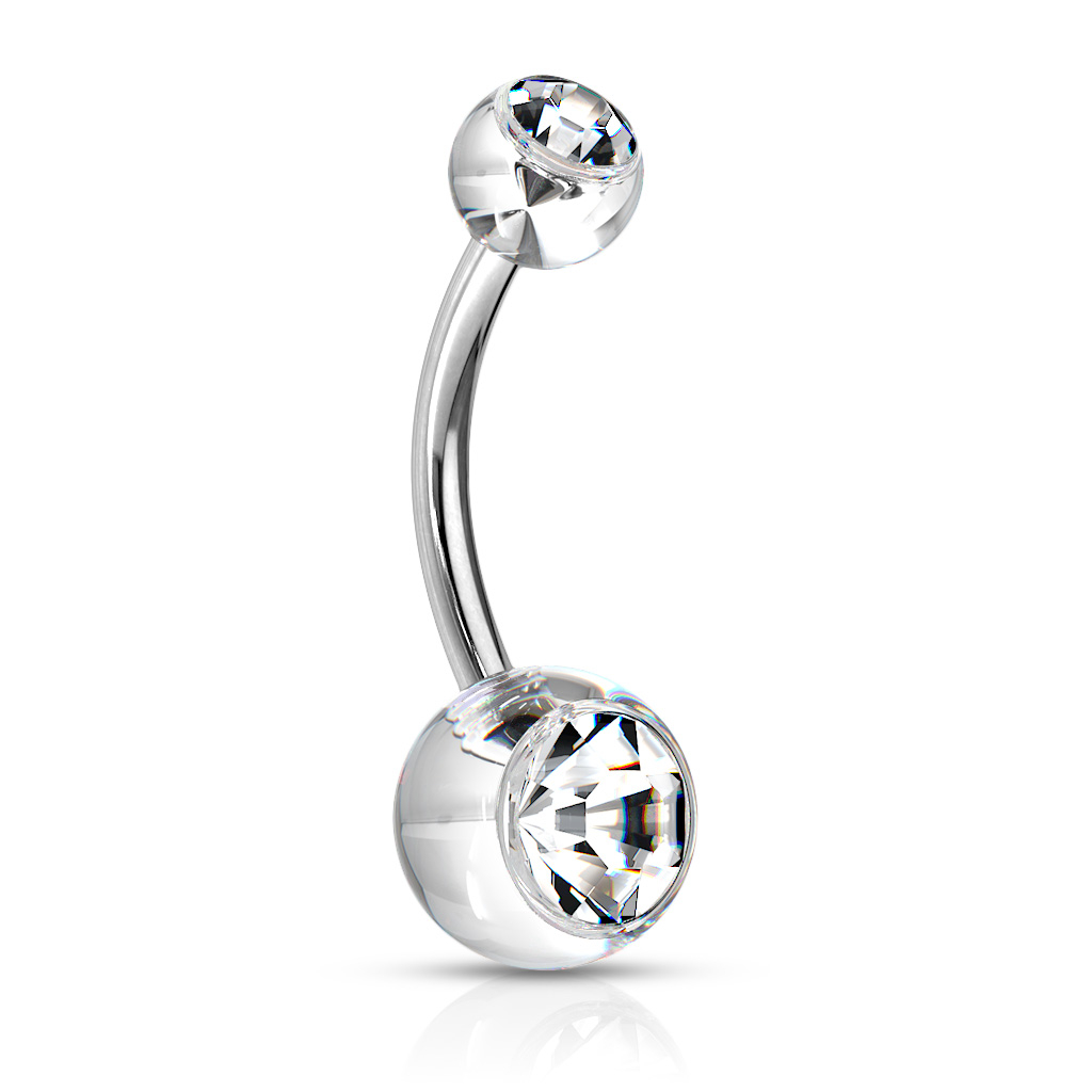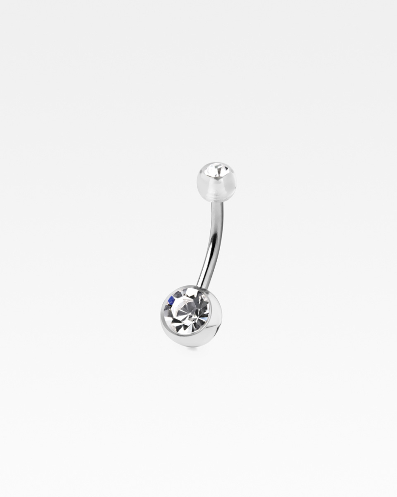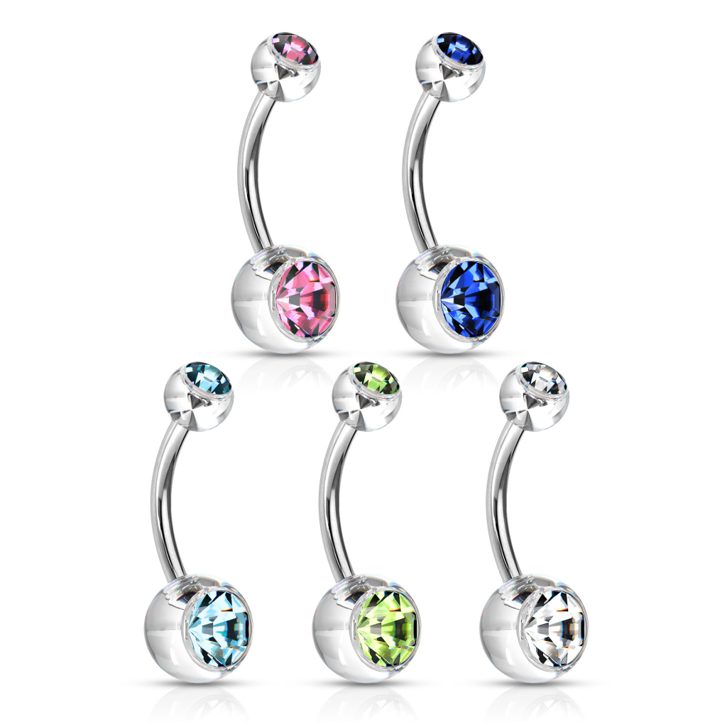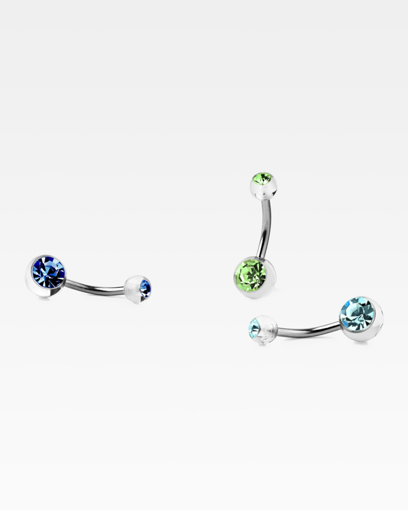 Acesta este un cercel de buric simplu dar frumos potrivit să fie purtat în fiecare zi, la un preț avatajos. Barbell este facută din oțel chirurgical și bilele din vârf si din capatul de jos sunt facute din acril. Ambele au pietre încrustate din care poți alege cinci culori diferite. Dacă alegi culoarea alb, vei obține un stil clasic. Dacă vrei niște culori mai îndraznețe, alege una care este în contrast cu culoarea pielii tale.