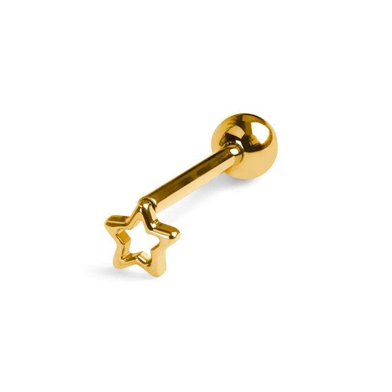 Acest barbell de limbă din titan cu stea este hipoalergenic, deci e potrivit pentru cei cu piele sensibilă. Are fir intern, așa că trebuie să inserezi tija subțire prin piercing și apoi înșurubezi.