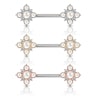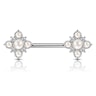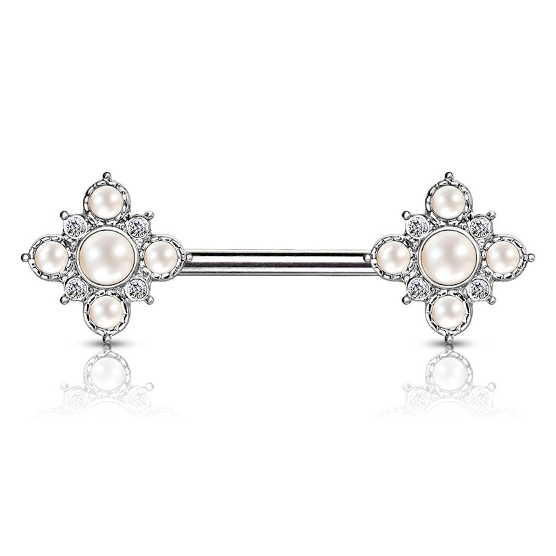 Barbell pe care o vezi în poza alăturată peste pentru tine dacă ai un piercing într-un sfârc sau în ambii. Piesa constă într-o bară chirurgicală cu o lungime de aproximativ 1/2 inches (12 mm) între flori. Fie că sunt flori sau nu, te lăsăm pe tine să decizi, dar cu puțină imaginație poți vedea o perlă mare ca centrul floarei și patru mici pietre ca petale. Între ele, patru mici cristale adaugă un touch frumos întregii piese.