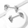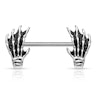 Dacă pui acest barbell de sân în piercing-ul tău, vei avea o mână schelet pe fiecare parte a sfârcului tău. Mâinile sunt conectate de o bară din oțel chirurgical cu o grosime de 14g (1.6 mm). Distanța dintre inimi este de aproximativ 1/2 inches (12 mm).