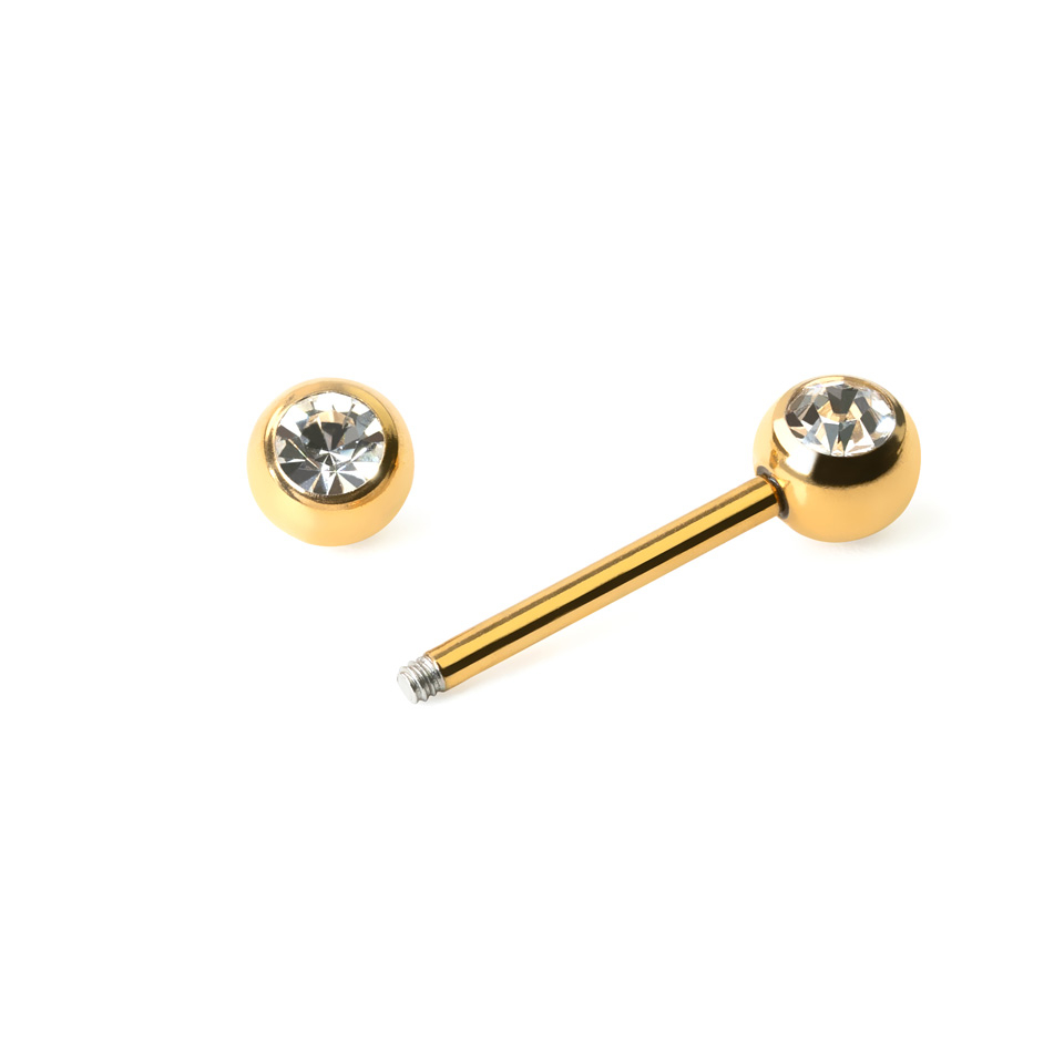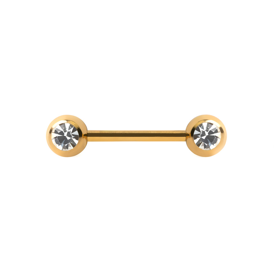 Tija are două bile mari de 6 mm. Nu este un piercing de sfârc discret deoarece bilele vor atrage atenția a oricărui le vede. În plus, bilele din un cristal încrustat. Pietrele rotunde au tăietura de diamant, deci vor străluci puternic când lumina le atrage.