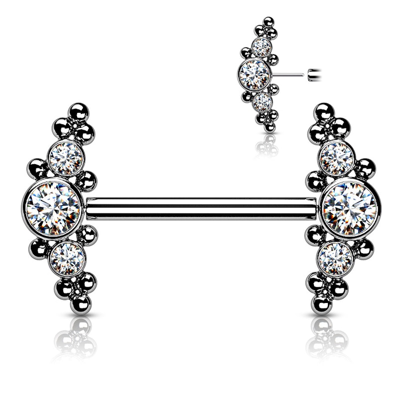 Calitate, deoarece bijuteria este făcută exclusiv din titan, și bara și capetele cu pietre. Capetele consistă într-o grupare de pietre și mici sfere. Cea mai mare piatră este în mijloc și celelalte mai mici pe margine. Micile sfere sunt montate pe oțel, făcând toată bijuteria să arate ca o grupare de pietre și bile. Prin urmare, bijuteria va sta în sân, depinzând doar de locul unde a fost făcut piercing-ul.