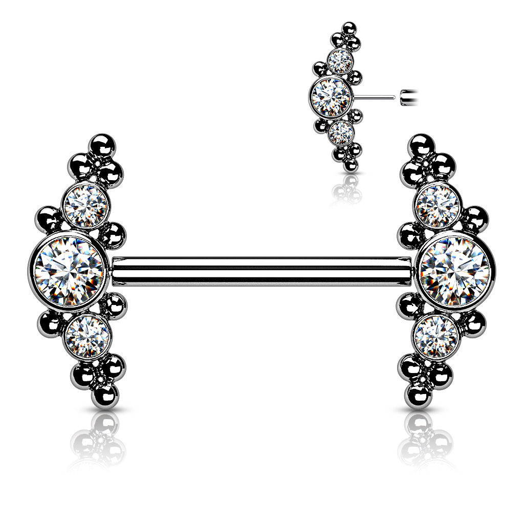Calitate, deoarece bijuteria este făcută exclusiv din titan, și bara și capetele cu pietre. Capetele consistă într-o grupare de pietre și mici sfere. Cea mai mare piatră este în mijloc și celelalte mai mici pe margine. Micile sfere sunt montate pe oțel, făcând toată bijuteria să arate ca o grupare de pietre și bile. Prin urmare, bijuteria va sta în sân, depinzând doar de locul unde a fost făcut piercing-ul.