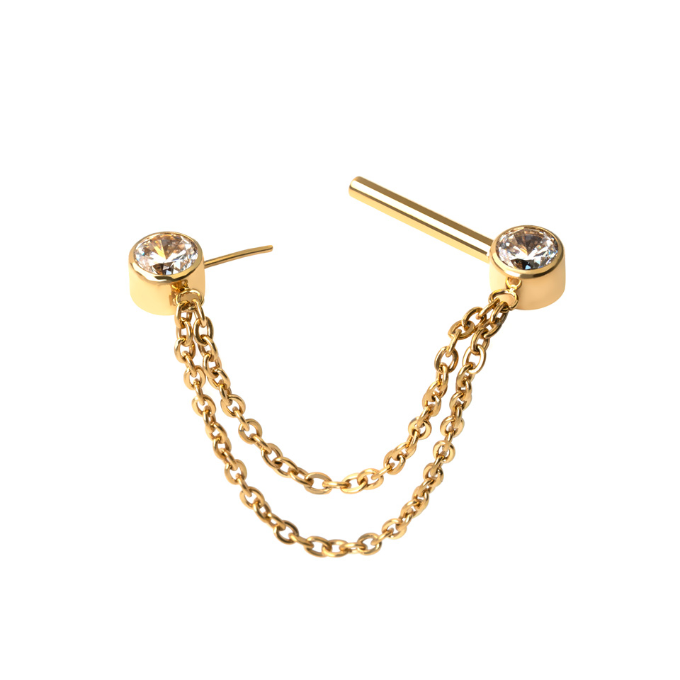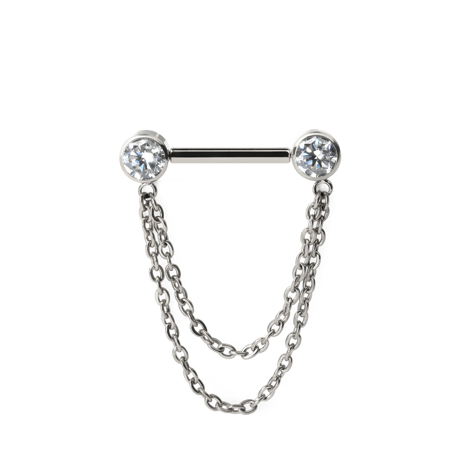 Acest barbell de sân este realizat din titan implant-grade și are două pietre de zirconiu încrustate în cele două bile. Bijuteria mai are două lanțuri din ttian care atârnă sub sfârc. Ele sunt conectate de bile printr-o buclă delicată.