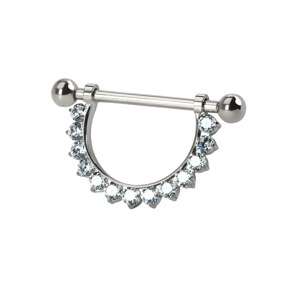 Acest cercel de sân superb este fabricat din titan implant-grade. Constă într-un barbell simplu cu fir intern care trece prin piercing, de care este atașat un semicerc spectaculos din pietre din zirconiu transparente cu montură pave care îți încadrează foarte frumos sfârcul.