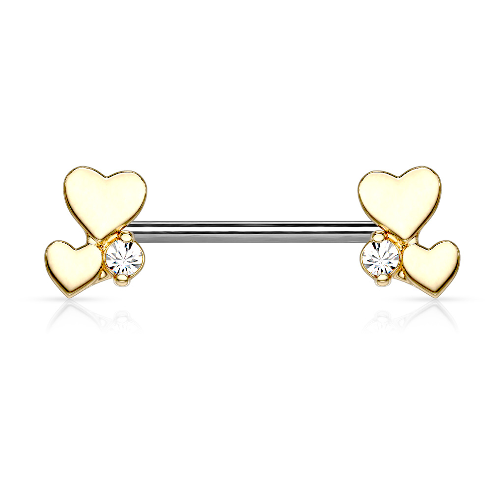 După cum am menționat, sunt două inimi la fiecare capăt, una ușor mai mare decât cealaltă. Între ele stă o piatră mică transparentă. Toate trei elementele sunt create din alamă. Ele sunt sudate împreună într-o piesă care poate fi deșurubată ca bara să fie inserată în piercing. Barbell este complet simetric ceea ce înseamnă că, capetele au o simetrie oglindă. Barbell de sân este disponibilă în două culori diferite. Poți alege capetele inimii fie din aur galben sau aur roz. Ambele sunt identice exceptând culoarea.