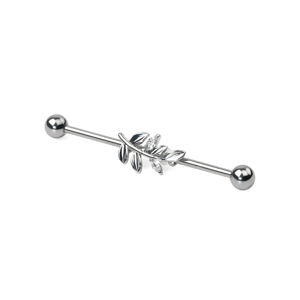 Florile și frunzele au fost întotdeauna la îndemână bijuteriilor și această barbell industrială nu este o excepție. În mijlocul barei este o tulpină cu frunze ce poate fi mutată în sus și în jos. Două frunze au fost înlocuite cu pietre transparente, ce oferă bijuteriei un touch extra. Tulpina poate fi fixată unde vrei tu cu ajutorul O-ringurilor oferite.