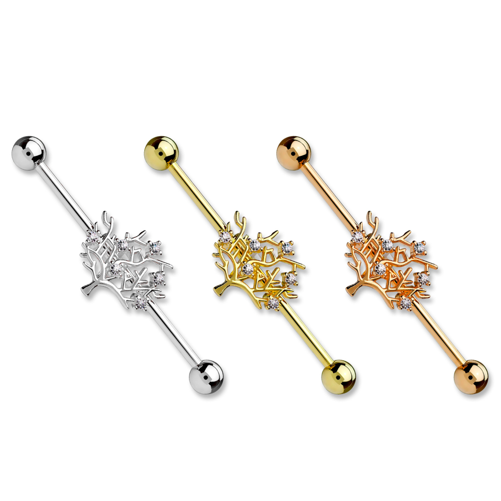 Tija este fabricată din oțel chirurgical și poate fi achiziționată în trei variante de culoare diferite. Numai culoarea este diferită, forma și pietrele sunt identice la orice culoare alegeți. Arborele în sine este fabricat din alamă și ulterior a fost colorat în aceeași culoare ca și tija pe care se află.
