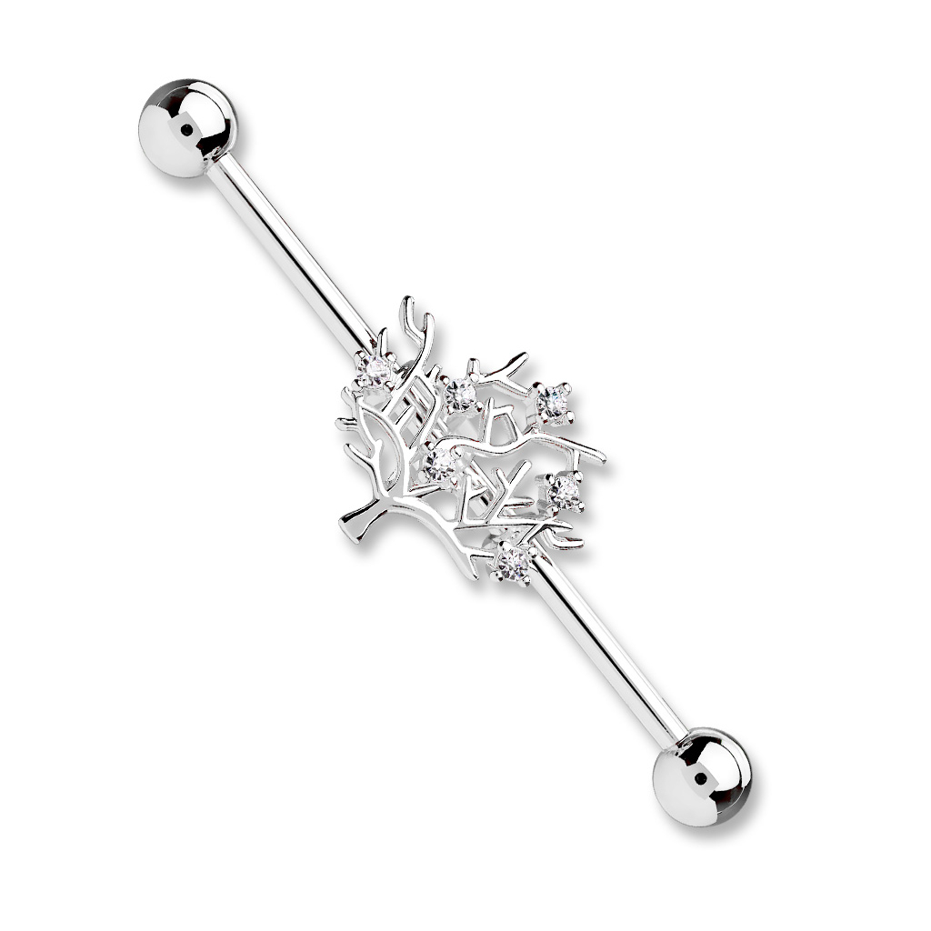 Arborele pe care îl vedeți pe această tijă industrială depinde în întregime de imaginați dvs. Arborele arată foarte golaș, deoarece nu sunt frunze pe el, dar pe de altă parte, pietrele mici transparente ca niște cristale par să atârne ca niște fructe mari luxuriante. Ar putea, bineînțeles, să fie și copacul vieții care este pus pe tija. Arborele se poate mișca liber pe tija lungă de 38 mm, deoarece pe spatele copacului există două inele metalice prin care trece tija. Nu înseamnă neapărat că nu puteți atașa copacul acolo unde vreți, deoarece acest lucru este posibil. În spatele copacului este plasat un inel mic de cauciuc, care vă asigură că pomul rămâne fix în locul în care este plasat.