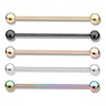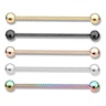 Această barbell este disponibilă în diferite culori, datorită placării rezistente ce trece testul timpului față de alte placări. Ambele, bara și bilele sunt suflate cu diferite culori din care poți alege. Bilele au un diametru de 5 mm. Bara are un ecartament de 14g (1.6 mm) și o lungime de 38 mm.