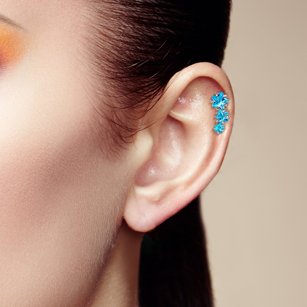 Oferă strălucire piercing-ului tău de helix purtând un strat de stele. Bijuteria are trei pietre în formă de stele, dispuse una în continuarea celeilalte. Rândul de stele descrie o curbă lejeră, care se adaptează fizionomiei urechii tale.
