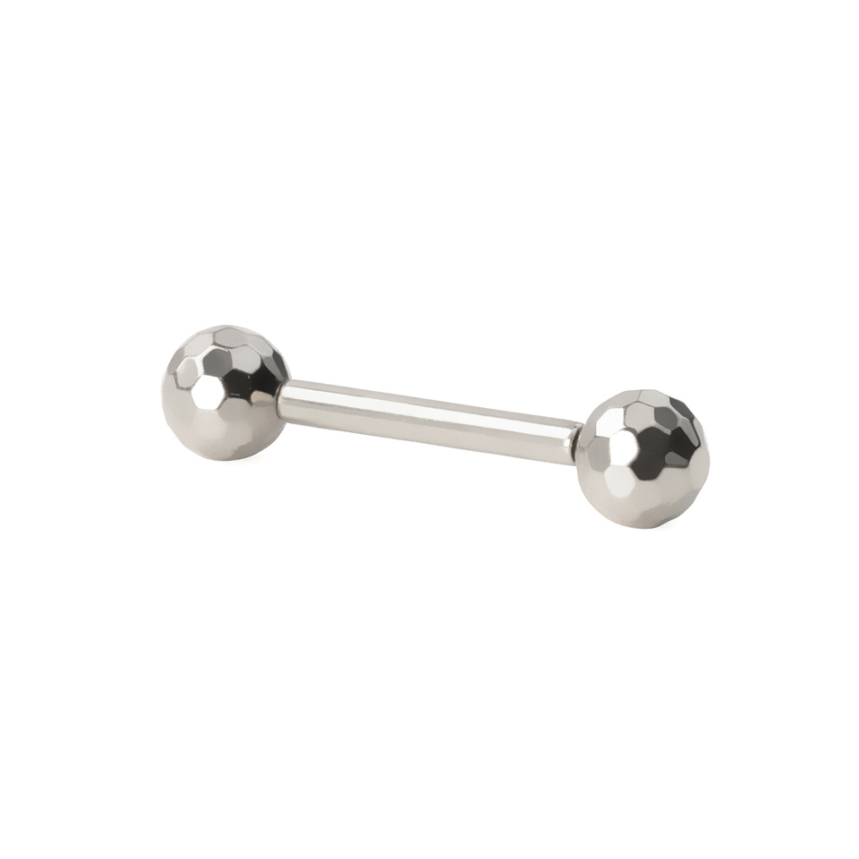 Acest barbell din titan are câte o bilă multifațetată la fiecare capăt ce dă impresia de dico ball. Bijuteria nu are fir intern sau este ”push in”, adică este super simplu de inserat pentru că trebuie doar să împingi bilele în piesa principală pentru a le fixa, ceea ce elimină dificultățile inserării prin înșurubare.
