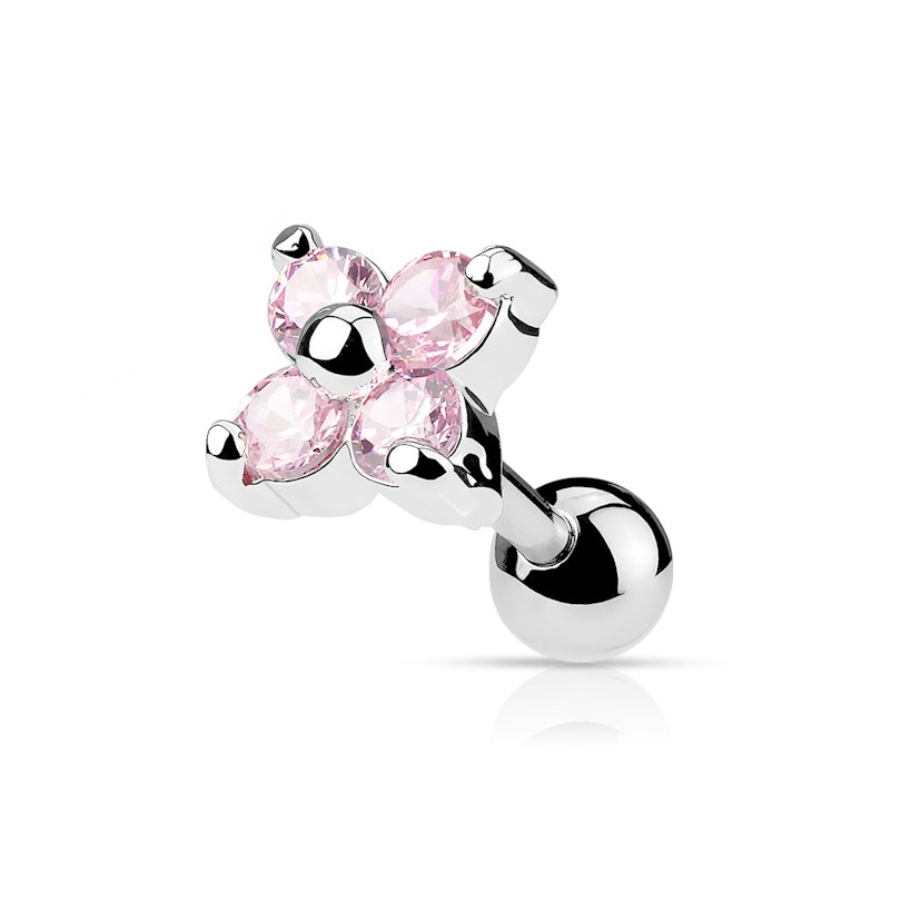 Această barbell de ureche este din oțel chirurgical, cu un design în formă de floare, și este disponibilă în trei culori. Pe fiecare floare există o piatră în formă de diamant.