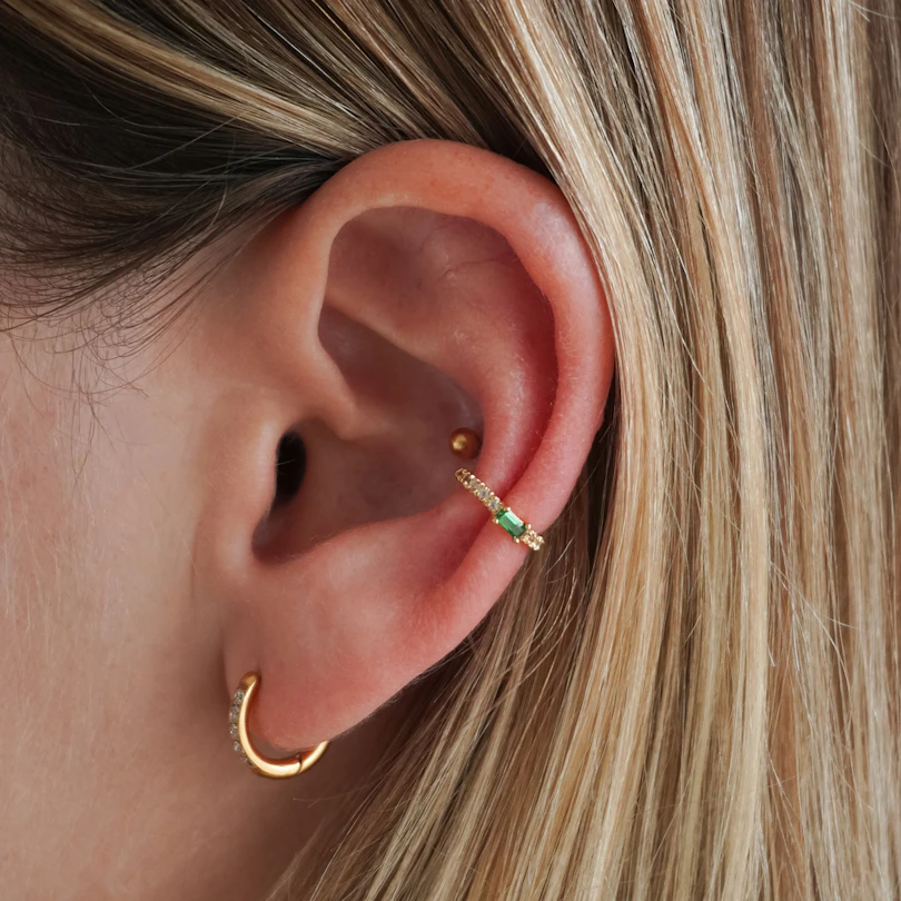 Un strop de verde poate schimba complet vibe-ul unei ținute. Această cătușă de ureche are o singură piatră verde care dă culoare fără să fie dominantă, o metodă simplă de a-ți completa look-ul cu ceva puțin neașteptat.
