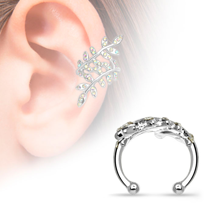 Alege din argintiu sau auriu ambele decorate cu pietre albe. Dar dacă ești în căutarea unui model delicat, poți alege modelul argintiu cu pietre cu un efect de aurora boreală. Aceste tipuri de pietre reflectă lumina în culorile curcubeului. Crează un efect unic atunci când cătușa urechii se mișcă.