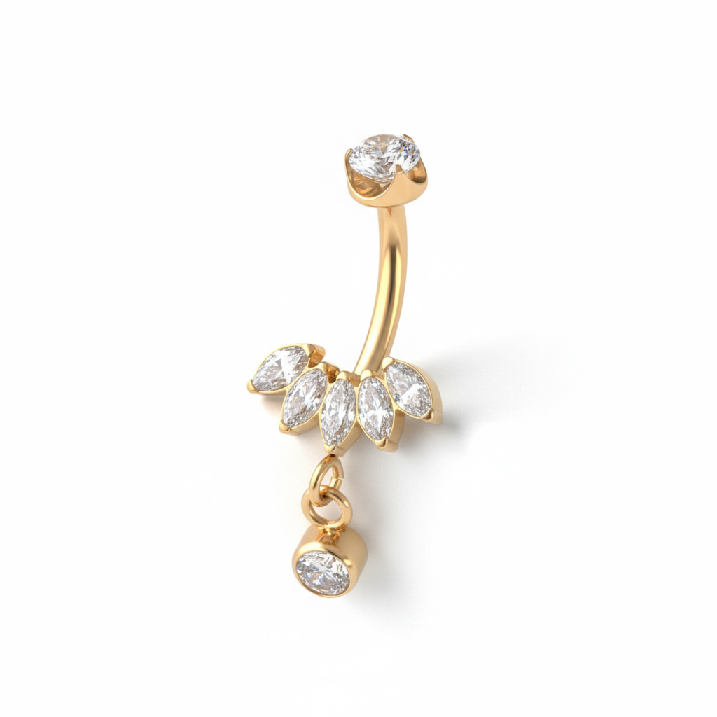 Fă cunoștință cu noul cercel de buric care e atât șic, cât și îndrăzneț. Acest cercel buric din titan cu pietre marchiză și pandant este hipoalergenic și rezistent la apă (da, fără rugină și iritații).