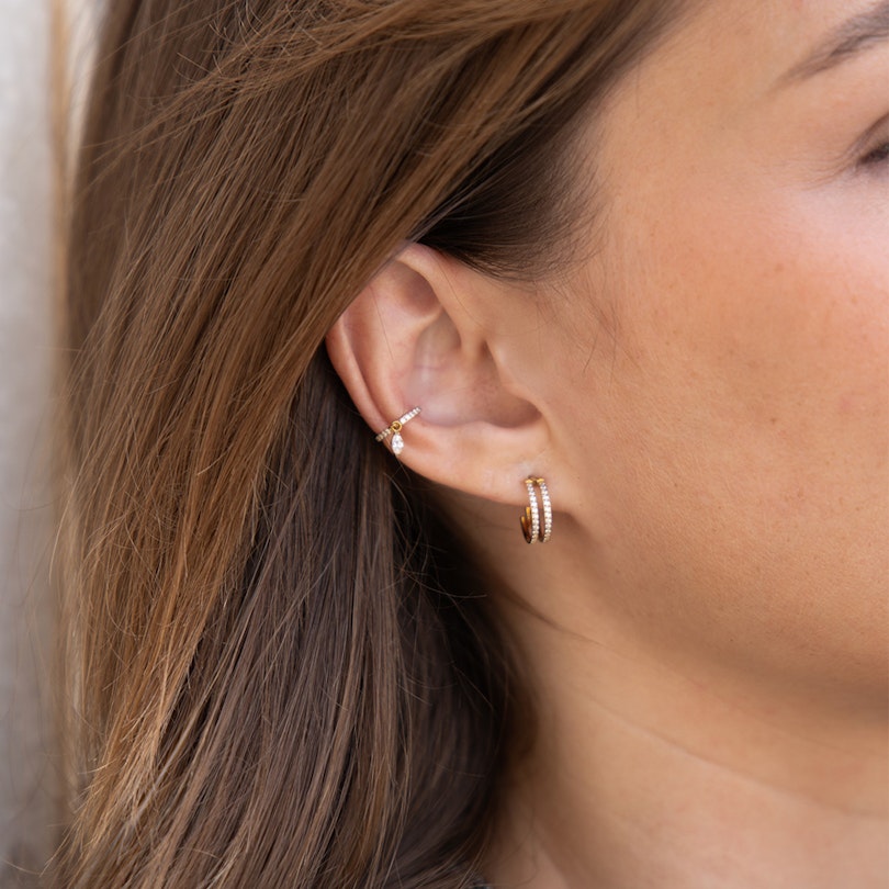 Acest cercel frumos are un șir de pietre de zirconiu micuțe dispuse pe lateral și o piatră mai mare taiată sub formă de marchiză prinsă într-un pandant elegant.