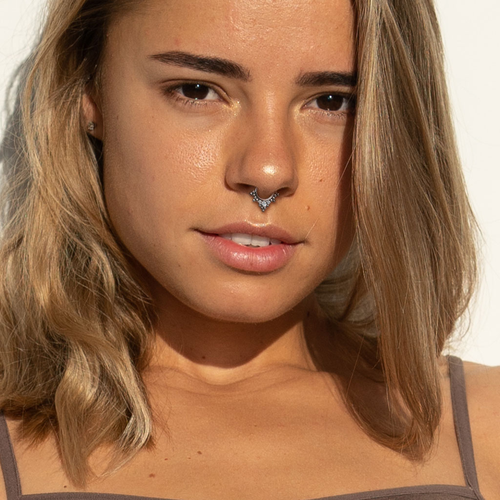 Cercelul pe care îl vezi în poză nu are părți detașabile. Prin urmare, nici o parte nu se pierde când inserezi bijuteria. Motivul este o mică balama care conectează cercelul de închizătoare. Închizătoarea este un mic segment luat din cercel care se deschide și închide ușor printr-un click. Pur și simplu trage balamaua și fă click când cercelul este pus. Și unde ar trebui să stea? Asta depinde doar de tine. Îl poți folosi în sept sau în diferite piercing-uri de ureche, depinzând de anatomia ta.