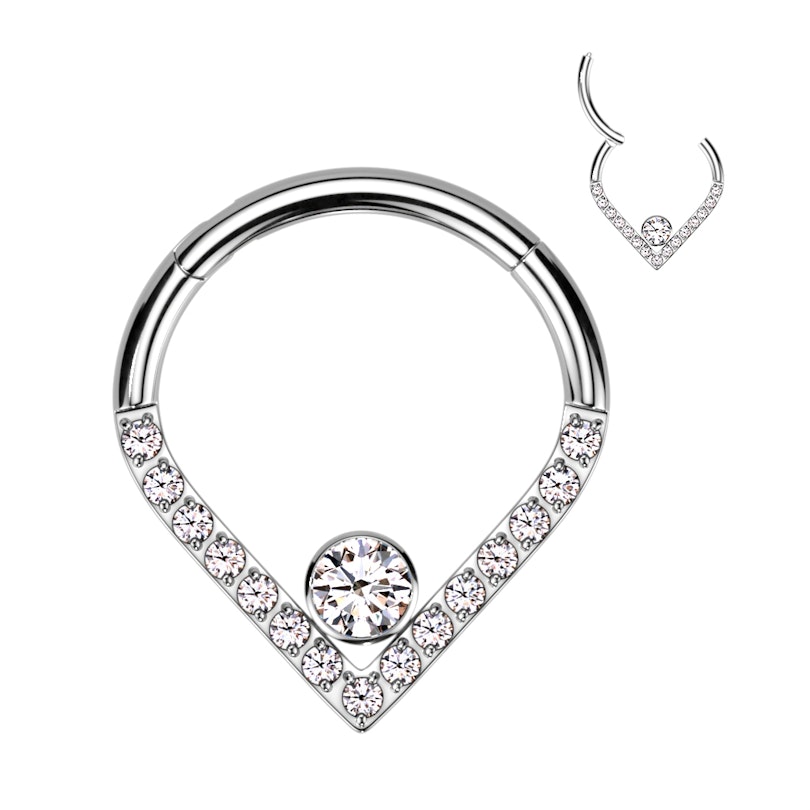 Aces cercel din titan cu balama are o piatră mare și altele mai mici dispuse în formă de V sau chevron.