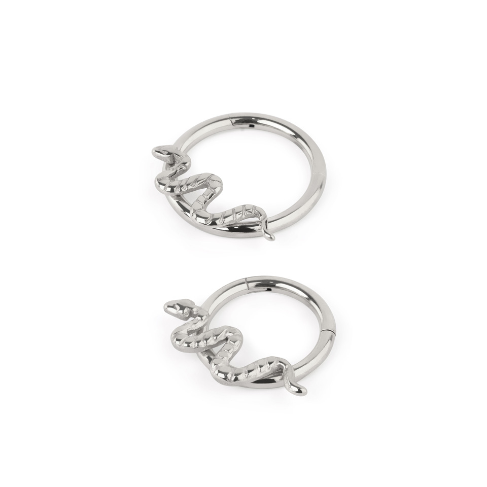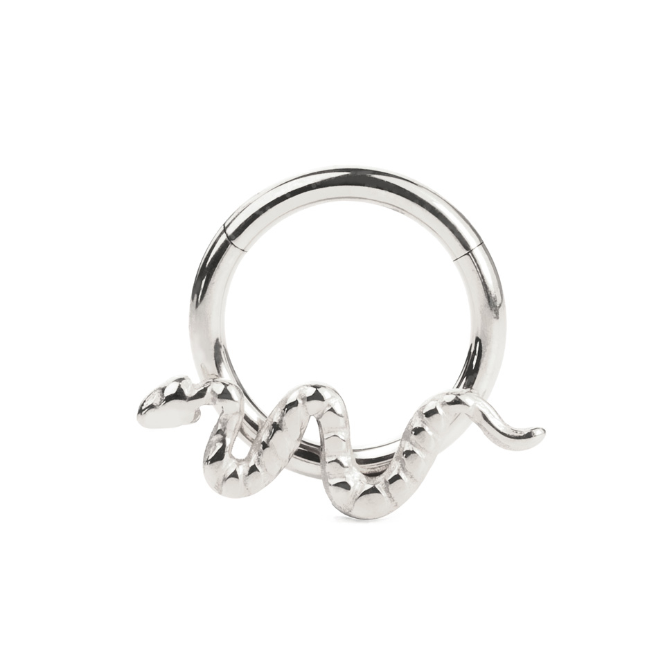 Șarpele stilizat care decorează partea frontală a bijuteriei îi conferă unicitate. Ține cont de poziția șarpelui pe cercel atunci când alegi în ce tip de piercing vrei să-l porți.