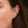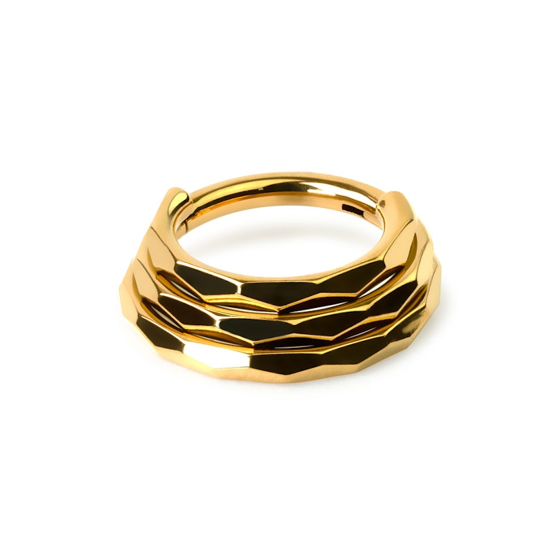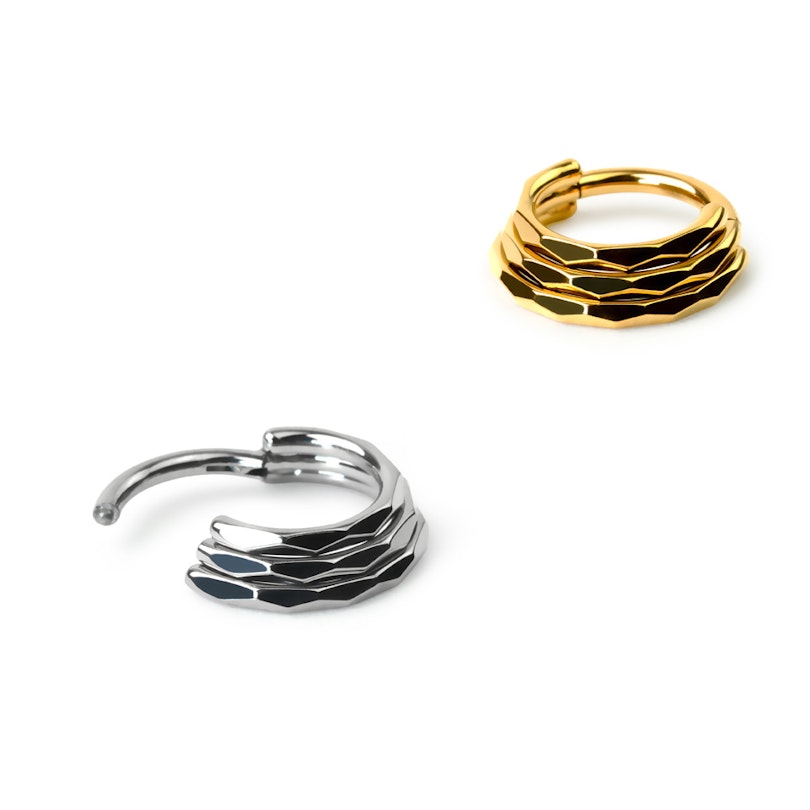 Acest cercel stilat cu balama dă impresia de 3 cercei în unul și numai cel din mijloc trece prin piercing. Partea exterioară a cerceilor are un model tip diamant, ceea ce dă bijuteriei un look cool și texturat.