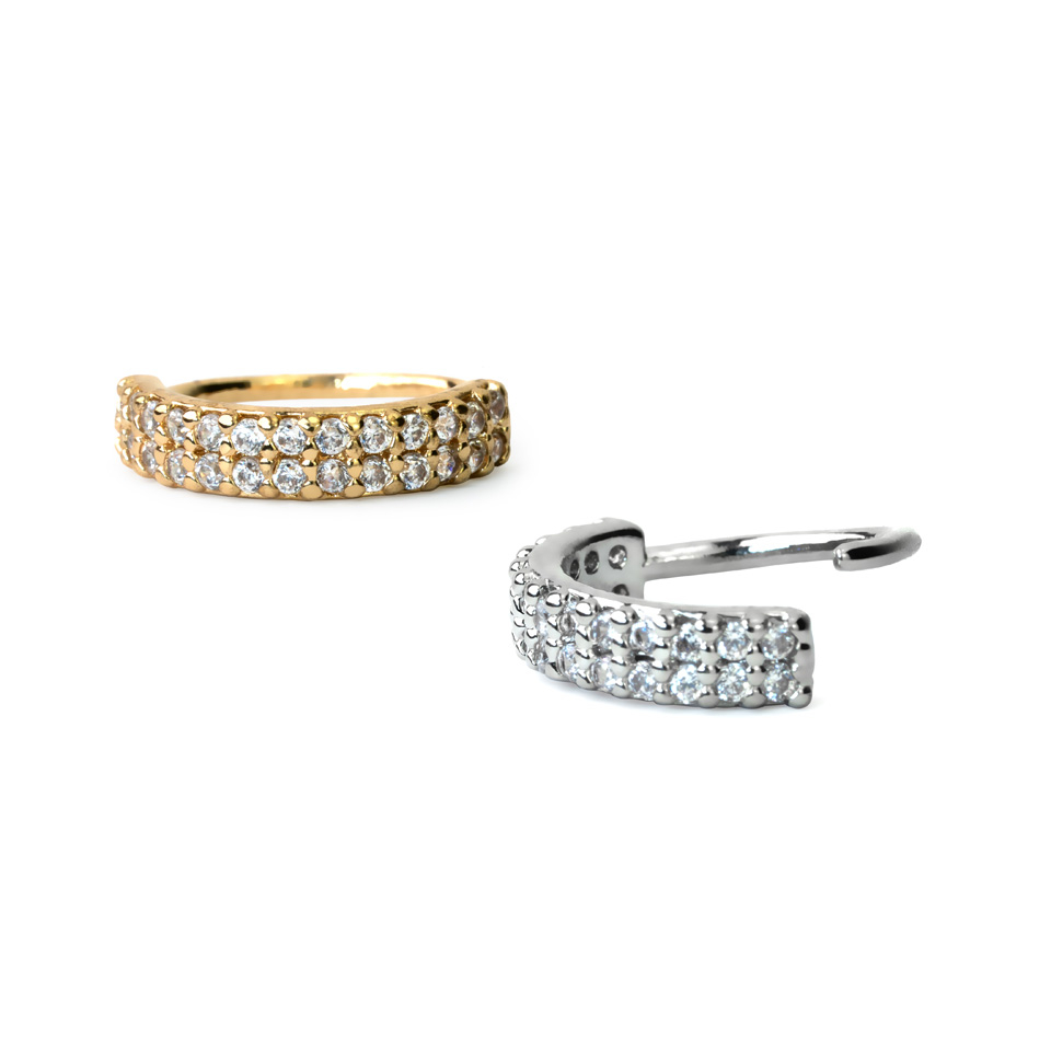 Cercelul prezintă nu mai puțin de două rânduri de pietre care acoperă aproape jumătate de cercel - 26 de mici pietre transparente în total. Pe cealaltă parte a cercelului ar trebui să stea în piercing-ul tău.