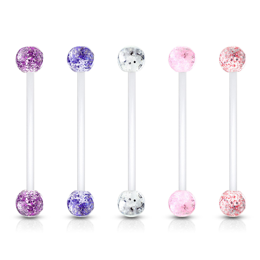 La fiecare capăt al barei, se găsește o bilă din acril. Aceste bile sunt decorate cu un strat de sclipici frumos. Bilele au un diametru de 6 mm și sunt disponibile într-o varietate de culori. Aruncă o privire meniului din dreapta pozei ca să selectezi favorita ta.