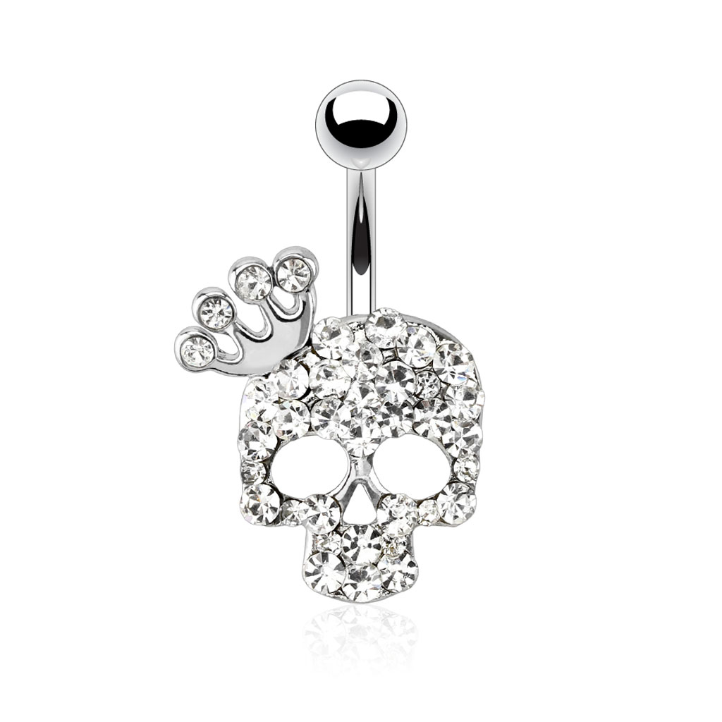 O barbell pentru piercingul ombilical foarte drăguță cu un craniu bătut în pietre care strălucește asemenea unui pumn de diamante. Mulțimea de pietricele transparente sunt așezate foarte apropiat unele lângă altele, astfel încât umplu întreaga suprafață a craniului, bineînțeles, în afară de cele trei găuri care sunt locurile ochilor și nasului. Locul ochilor este marcat ca două orbite mari goale, în timp ce nasul este marcat ca un mic triunghi chiar în mijloc și ușor sub cei doi ochi rotunzi.