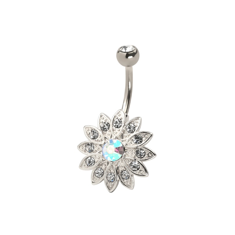 Spune-o cu flori sau cu aceasta floare imensă ce cu siguranță va atrage toata atenția asupra buricului tău. Acest cercel de buric din oțel chirurgical prezintă o floare mare care atrage atenția pe bila de jos a tijei. Bila din vârf are 5mm și este o piatră cristal încrustată ce face sa fie în contrast cu frumoasa floare.
