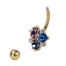 Acest cercel din oțel chirurgical are o bilă de 5 mm în vârf și un grup de cristale divers colorate, în culori complementare, fixate în gheruțe la baza lui.