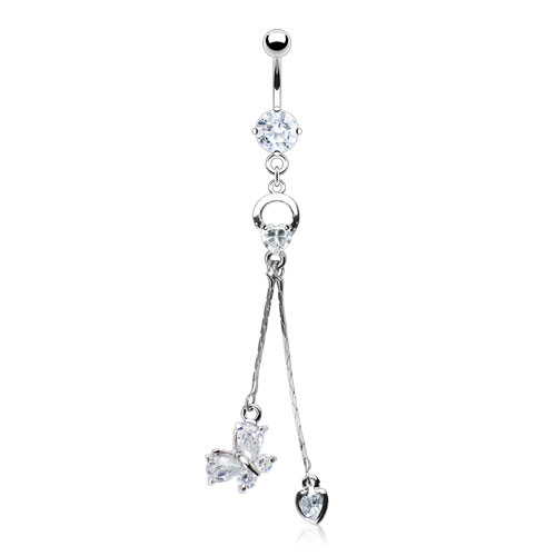 Un cercel ombilical cu adevărat exclusivist cu lănțișoare lungi și detalii frumoase din pietre transparente. Pandantivul este decorat cu o inimă frumoasă dintr-o piatră transparentă. Sub această inimă există un alt cercel, la care sunt atașate cele două lănțișoare lungi, independente unul de celălalt. Lănțișoarele nu sunt lipite și, prin urmare, se pot mișca liber odată cu mișcările corpului.
