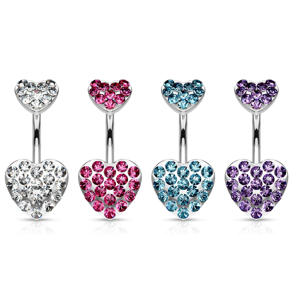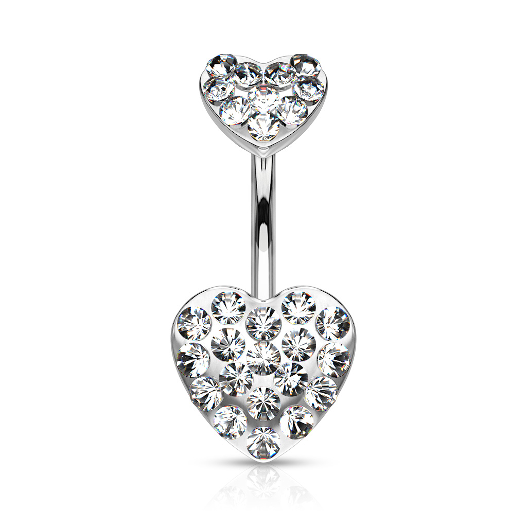 Este făcut din oțel chirurgical și bara are lungimea de 10 mm. În loc de clasicul vârf și capăt din bile, are două inimi cu multe pietre încrustate, trăsătura care face cercelul de buric să iasă în evidență cel mai mult. Aceste mici pietre seamănă cu niste diamante care permit ca lumina să se reflecte asupra lor din mai multe unghiuri. Poți alege dintre cinci modele diferite pentru acest cercel de buric, toate în culori spectaculoase.