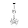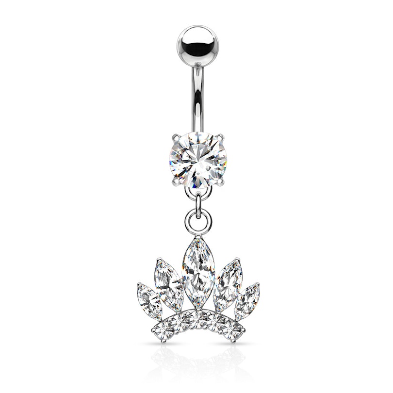 Devino prințesă sau un prinț (dc nu!?) atâta timp cât porți acest cercel pentru gaura din buric super sweet cu un pandantiv decorat cu pietre. Această coroană feminină este plină de pietre: partea de sus este formată din cinci pietre ovale, cea din mijloc fiind cea mai lungă.