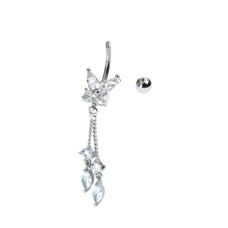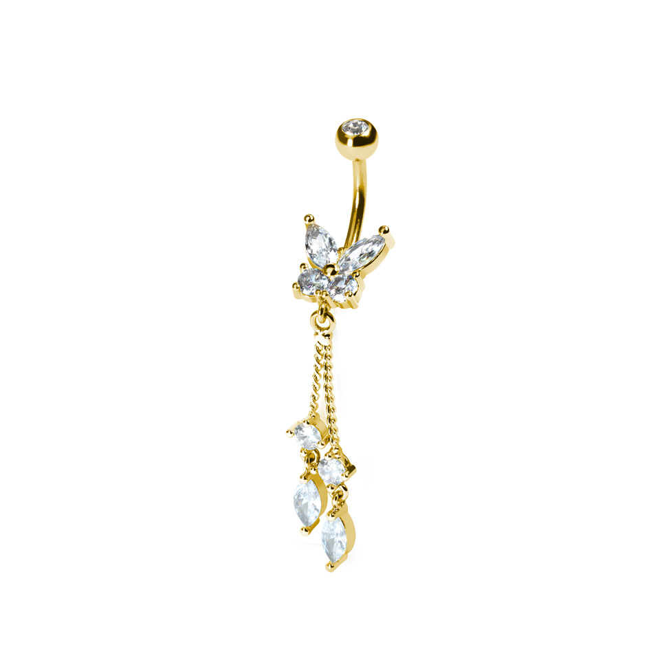 Acest cercel de buric strălucitor are un fluture frumos pe bila de jos, cu mai multe pietre strălucitoare în pandantele care sunt conectate de fluture prin lanțuri delicate.
