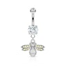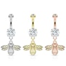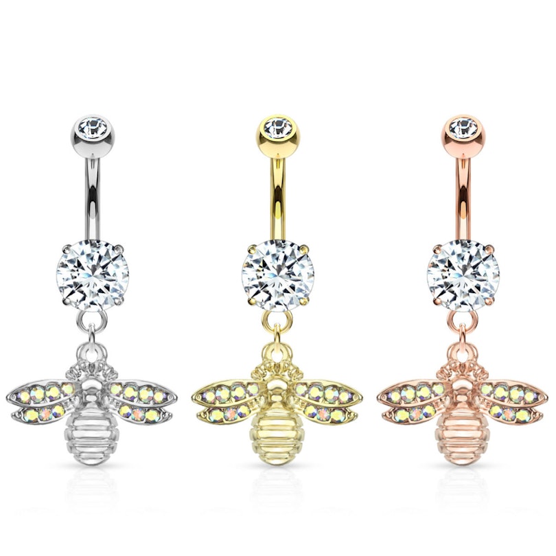Cercelul de buric pe care îl vezi aici, are o mică albină de atârnă de pandantiv. Albina este creată din alamă și aripile includ multiple pietre mici ce reflectă majoritatea culorilor curcubeului. O putem numi aurora boreală, deoarece ne amintește de luminile nordului. Albina atârnă de o bară curbată de 10 mm cu un ecartament de 14g (1.6 mm). Este făcută din oțel chirurgical, precum majoritatea altor cercei de buric pe care îi vei găsi în magazin.