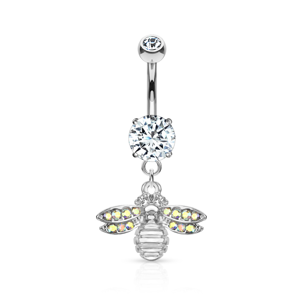 Cercelul de buric pe care îl vezi aici, are o mică albină de atârnă de pandantiv. Albina este creată din alamă și aripile includ multiple pietre mici ce reflectă majoritatea culorilor curcubeului. O putem numi aurora boreală, deoarece ne amintește de luminile nordului. Albina atârnă de o bară curbată de 10 mm cu un ecartament de 14g (1.6 mm). Este făcută din oțel chirurgical, precum majoritatea altor cercei de buric pe care îi vei găsi în magazin.