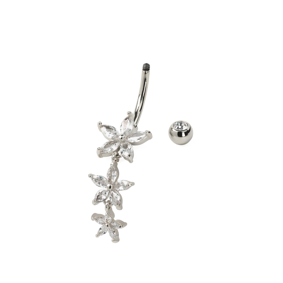 Acest cercel de buric conține tot ce îți poți dori: flori și pietre. Sunt plasate în combinații, cu cine pietre marchize care formează cinci petale ale celor trei flori. Floarea din vârf este cea mai mare și devin mai mici graduat spre capătul de jos. Floarea din vârf este plasată în bila din capătul de jos, în timp ce celelalte două atârnă liber sub.