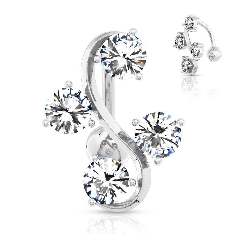 Acesta este un cercel de buric original și draguț cu patru pietre împletite în forma S. Va arata superb în jocul luminii pentru ca designul permite să se vadă pielea printre el. Este facut din oțel chirurgical, cel mai folost material în industria bijuteriilor piercing. Nu eliberează particule de nichel și este incredibil de rezistent.